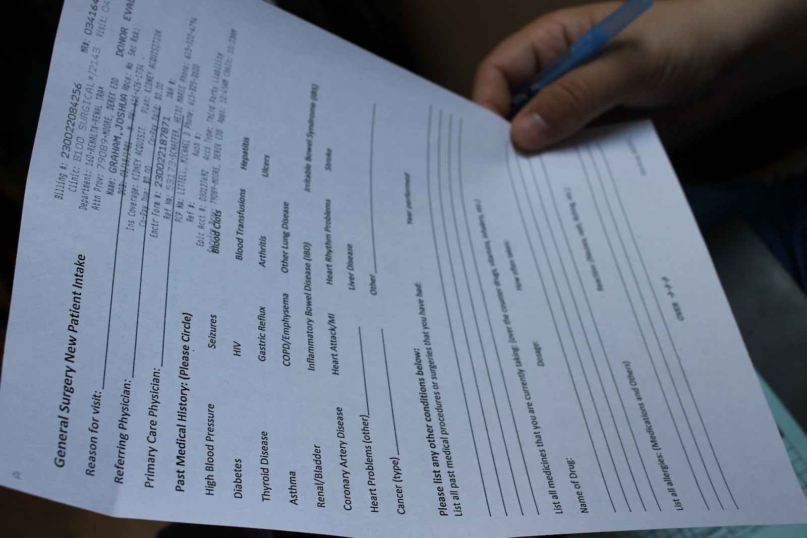 He filled out forms... Only he didn't need to check any boxes. That is the kind of person that they like in the kidney donation world- The healthy kind :)